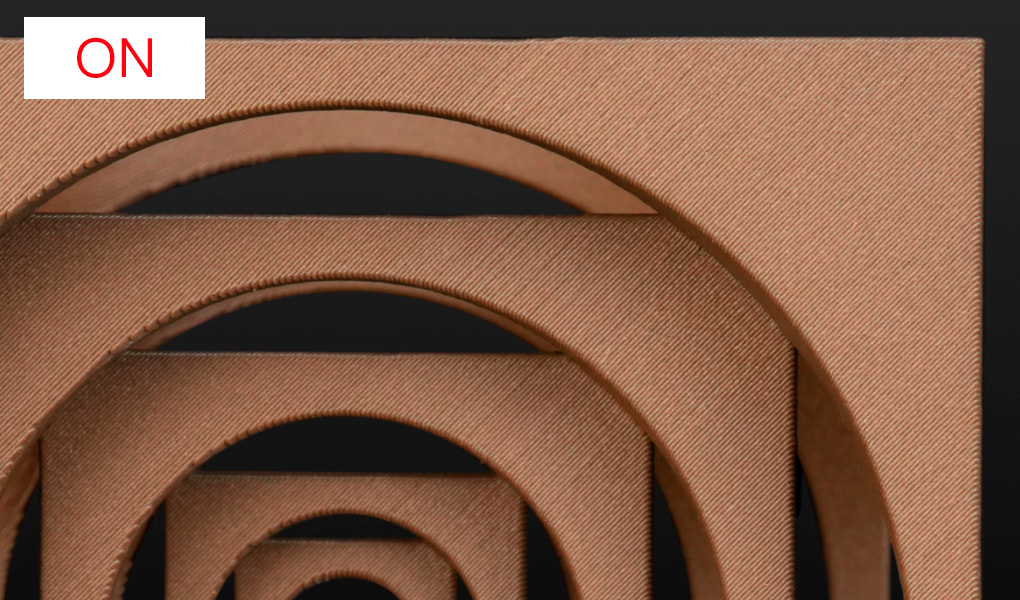 (テスト条件:直径250 mmの円形モデル、外壁1周/Bambu Lab ABS/造形温度280 ℃)