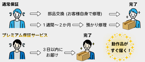 プレミアム保証サービスは、故障が発生した際、センドバックにて修理対応または整備品(良品)と交換が可能できる有償の保証サービスです。