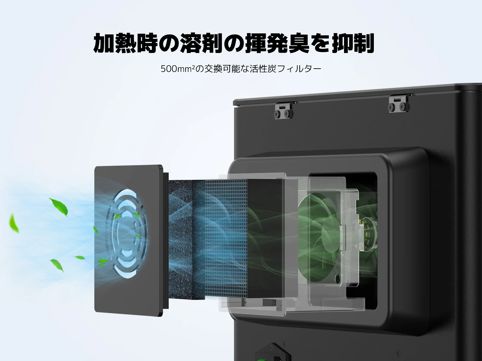 加熱時のレジンや付着した溶剤の揮発臭を抑制する、500mm²の交換可能な大型活性炭フィルターを搭載しています。