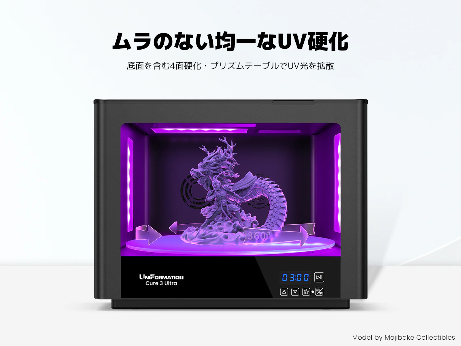 底面・上面を含む4面に配置されたUV光と、光を拡散するプリズムテーブルでUV光をムラなく全体に照射し、