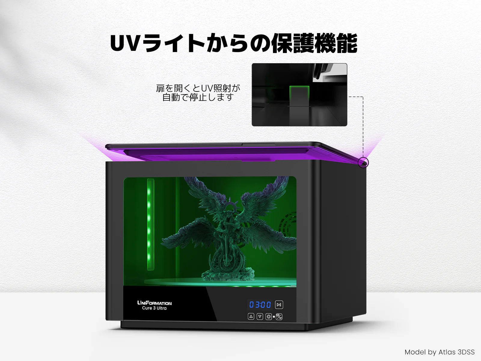 扉を開くとUV照射を自動で停止する機能を搭載し、安全性に配慮しています。