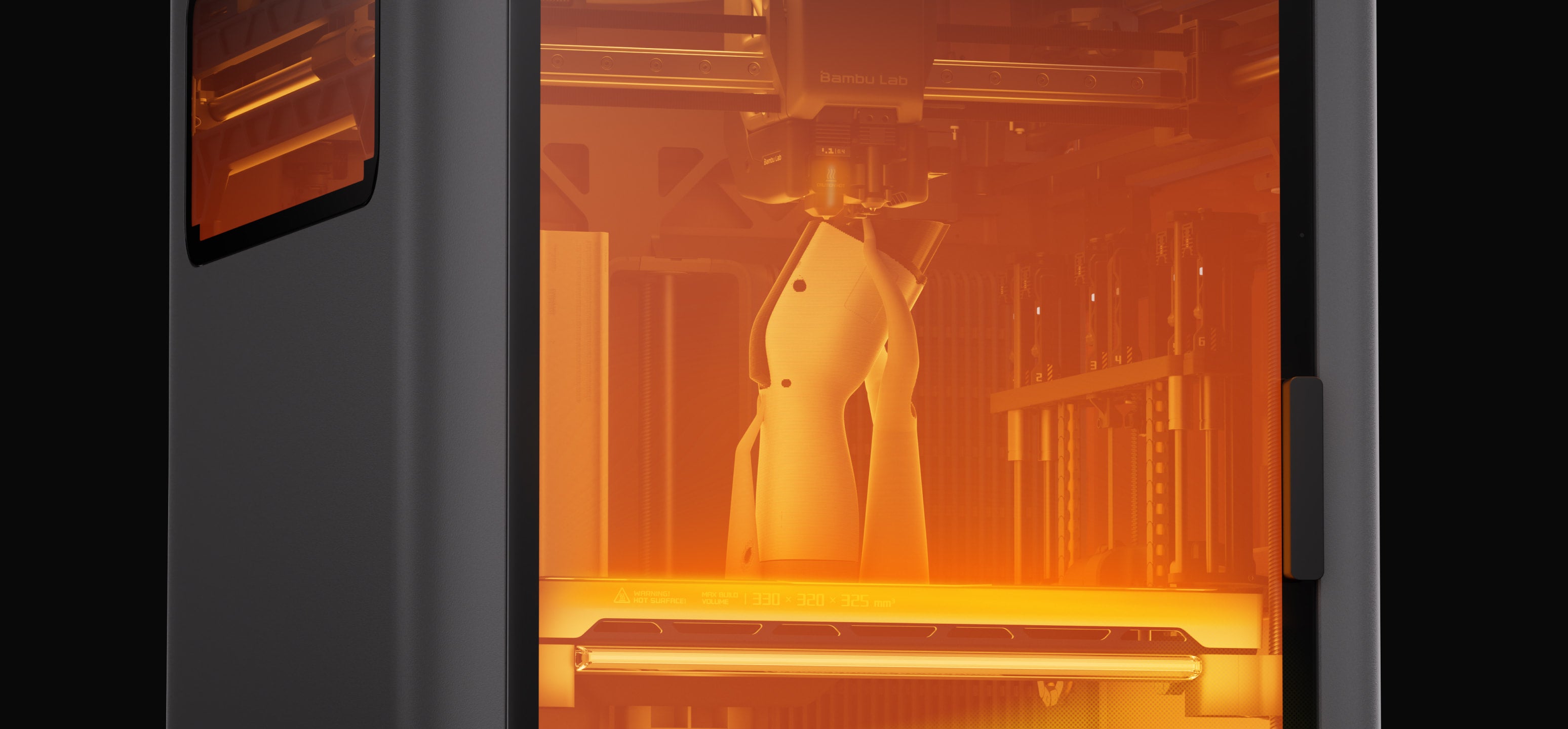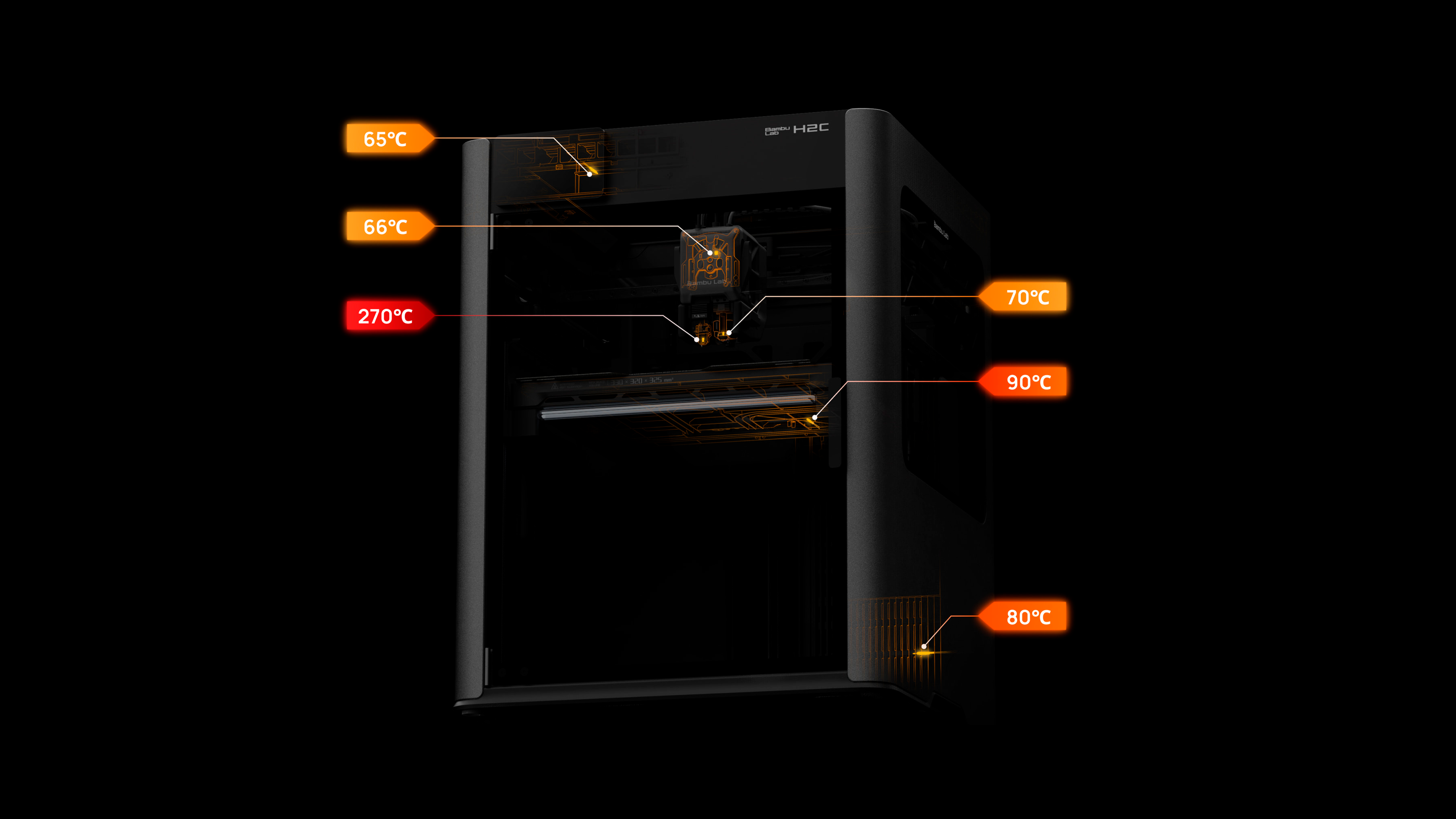 H2C はシームレスなエンクロージャと適応型エアフロー システムを備え、65℃のアクティブチャンバーを搭載。高性能材料の安定した造形が可能です。