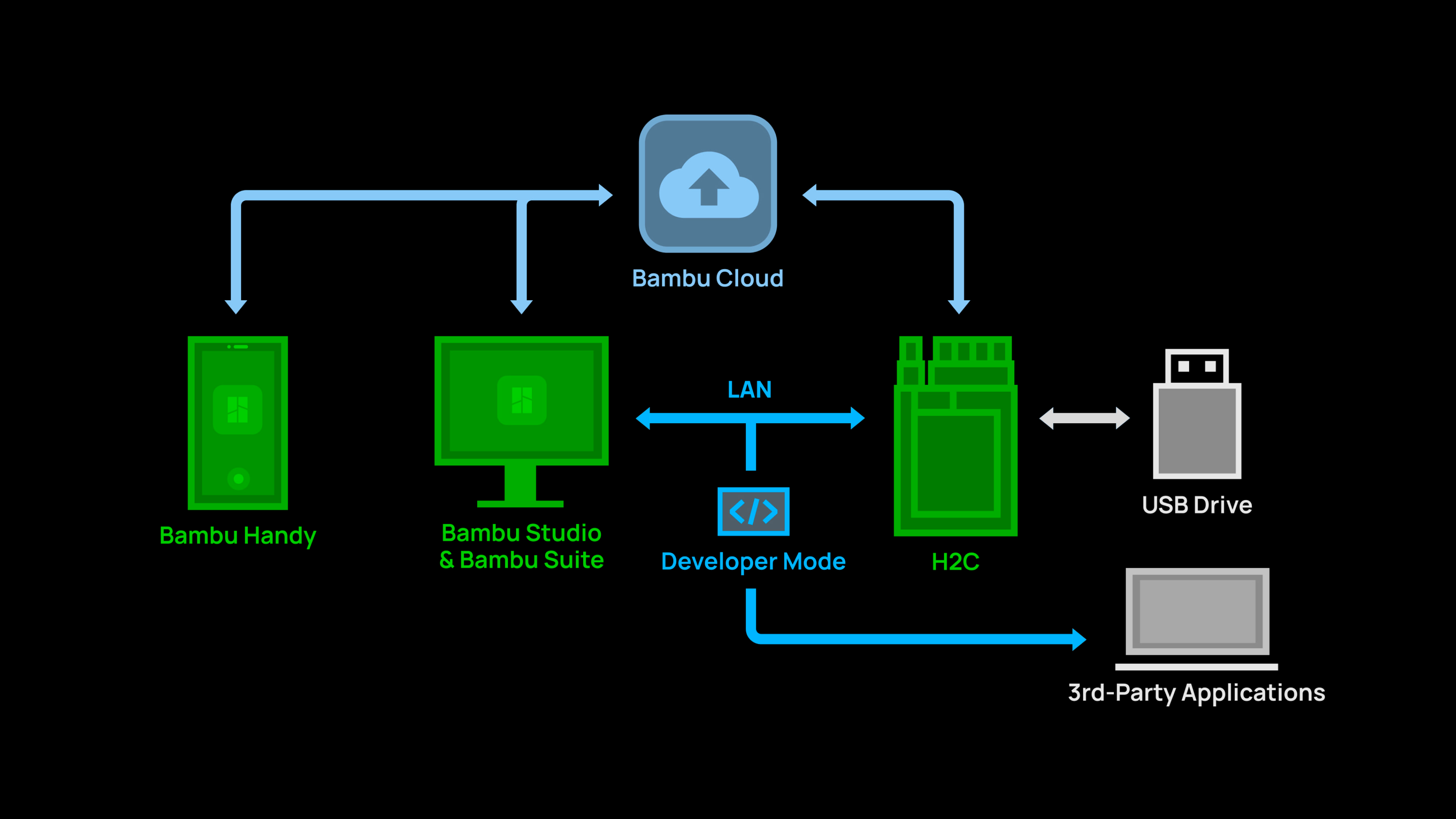 H2Cは、あらゆるデバイスからリモート制御できる便利なクラウド接続を提供します。セキュリティが重視されるアプリケーション向けに、完全なオフライン機能も提供し、完全な物理的分離を実現します。ユーザーは、インターネット接続なしでプリンターの操作、ファイルの送信、ファームウェアのアップデートを行うことができます。上級ユーザー向けには、開発者モードによりMQTTポートへのアクセスが可能になり、サードパーティ製コンポーネントやソフトウェアとの統合が可能になります。※有線LAN非搭載です。