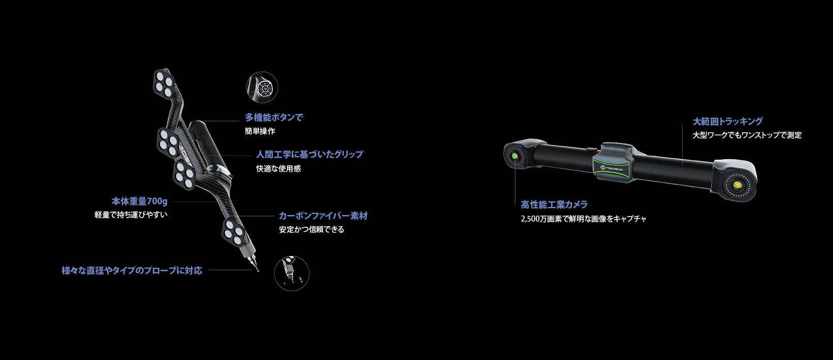 これにより作業現場や屋外環境でも高精度な動的追従測定が可能で、複雑な曲面や高精度部品、大型構造部品などであっても正確な三次元測定が可能です。